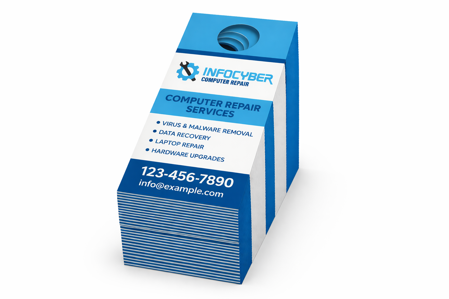 Standard door hangers are printed in full color on 100lb gloss cover, 100lb gloss book, and in 14pt and 16pt C2S stocks. Available in several sizes and coatings with the option to print on both sides.